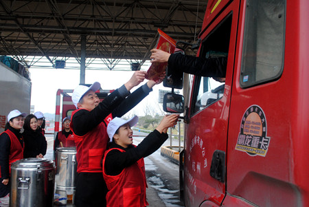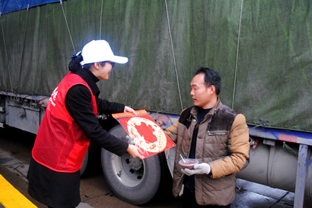 圖為志愿者給過往司機送上臘八粥