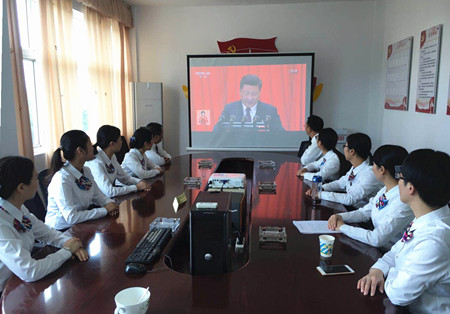 圖為員工在認真收看十九大開幕會