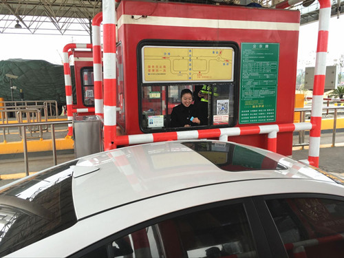 圖為工作人員在收費站外廣場引導車輛有序通行