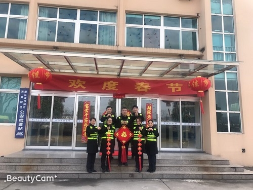 圖為布置好的辦公樓現場 下午,大家對管理房辦公樓道的蜘蛛網進行了清理,對大門口進行布置:掛起燈籠、貼上對聯、拉好橫幅和彩旗??紤]到春節期間保潔員放假,生活垃圾較以往會有所增加,特在各角落多增放了幾只垃圾桶。 負責掃塵的同事認真對待,干勁十足。在大家的共同努力下,經過掃塵后的所面貌煥然一新,節日的氛圍較為濃厚。該所負責人要求大家尊重今天的勞動果實,春節期間繼續做好保潔工作。最后,大家即興在大門口合了影,并送上新年的祝福,擁抱充滿希望的2019年! 夏蓮萍