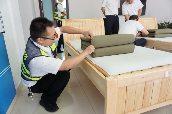 圖為比賽現(xiàn)場 活動現(xiàn)場,裁判宣布比賽規(guī)則及打分標(biāo)準(zhǔn):評分從被子整體形狀、平整度、棱角明顯、折疊時間等方面判斷,規(guī)定在5分鐘內(nèi)完成,共設(shè)置一、二、三等獎三個獎項。內(nèi)務(wù)半軍事化在該所已是常態(tài),參賽選手們很快進入狀態(tài),從鋪到疊再到整,駕輕就熟,均能在規(guī)定時間內(nèi)整出“豆腐塊”。評委現(xiàn)場進行點評和打分。經(jīng)過競逐,最后副站收費四班何翊平奪得一等獎。比賽分四輪進行,且全程用時不到1個小時。