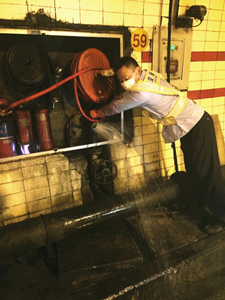 執(zhí)勤隊(duì)員們有序分工,紛紛帶上工具,開始檢修消防設(shè)備、清洗隧道內(nèi)攝像頭、維修陳舊的機(jī)電設(shè)備、拆換燈具等等,現(xiàn)場一派忙碌的景象。四公里長的隧道內(nèi)有82個(gè)消防箱,每隔50米就有一個(gè),而里面空氣質(zhì)量很差,比霧霾嚴(yán)重?cái)?shù)百倍,僅一只口罩根本凈化不了廢氣,但由于時(shí)間緊,任務(wù)重,隊(duì)員們顧不上惡劣的環(huán)境,努力和時(shí)間賽跑,爭取高效完成任務(wù)。