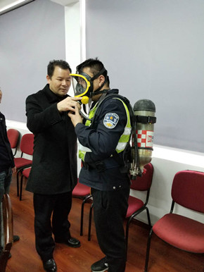 培訓中,陶文輝講解了“高速隧道火災特點”及呼吸器、防化服的使用方法及相關要求。話題開啟后,隊員們紛紛參與討論,爭相發言,講述各自在隧道事故處理中施救和應對的經歷與心得,交流平日巡查中所需注意的事項,互相提醒工作中的不足,并針對實際問題提出了許多建設性意見。同時,在主講人的現場演示下,參訓人員逐個“以身試法”,進一步熟悉和掌握了防毒面罩的穿戴方法。
