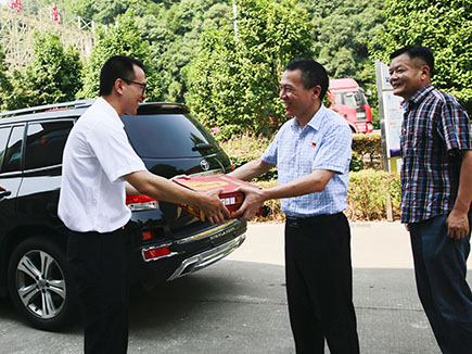 圖為公司副董事長、總經理張建平給內環路一線人員送上消暑慰問品 張建平親自將一箱箱的消暑慰問物資送到每位一線工作人員手中,向他們表達公司的謝意。同時詢問了工期進展情況,當前存在的困難和問題,要求他們注意安全,合理安排工程,保證施工質量,上下同心,不懈努力,確保11月11日主線通車目標的實現。