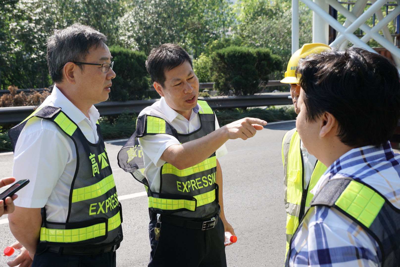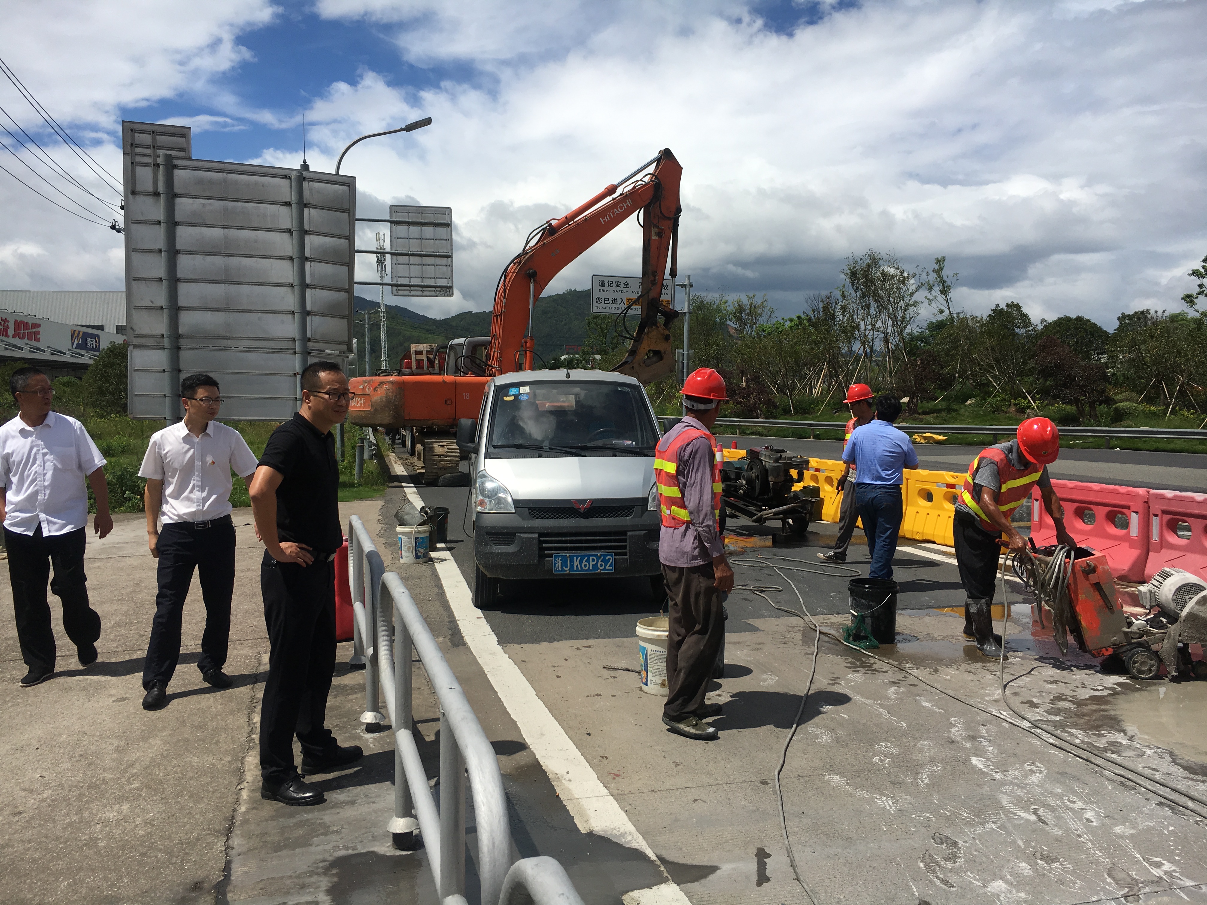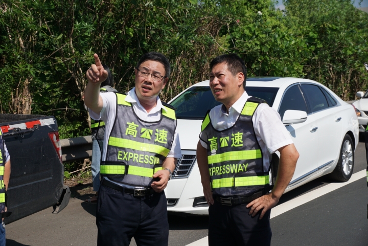 在甬臺溫高速公路臺州段溫州方向主線K1668+200M處現(xiàn)場,陳文波詳細了解龍門架吊裝的施工工序、取消省界收費站總體施工進展情況、項目時間節(jié)點、人員班組安排及安全措施準(zhǔn)備情況等。