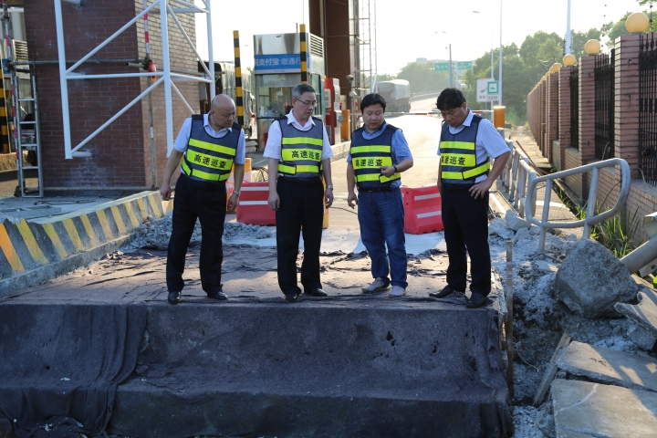 圖為陳文波檢查臺州收費站內(nèi)廣場隔離墻