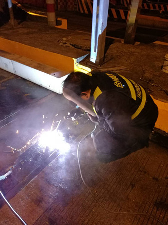到了現(xiàn)場,隊(duì)員發(fā)現(xiàn)該車道輪檢器鐵板螺孔由于不斷摩擦并逐漸變大,導(dǎo)致整顆螺栓脫離底下固定螺座,加之當(dāng)天是春節(jié)高速免費(fèi)第一天,車輛經(jīng)過時(shí)車速都較快,直接將整塊鐵板帶離底座。如果不及時(shí)對鐵板進(jìn)行加工恢復(fù),不僅不能保護(hù)下面的輪檢器,而且還有可能造成車輛爆胎。可除夕夜全部加工廠都已關(guān)門,如果讓廠家發(fā)貨至少也要好幾天。正在兩難之際,中心副經(jīng)理葉俊想到將鐵板與底座邊緣直接焊死的臨時(shí)應(yīng)急方法,待節(jié)后再向廠家定制或重新購買。 方案有了,大家兵分兩組,一組去中心倉庫拿電焊機(jī)、電焊條等設(shè)備,一組待在原地清理鐵底下方於泥等雜物,為隨后的電焊工作做準(zhǔn)備。設(shè)備到位后,葉俊一手操起電焊罩,一手熟練的將電焊條點(diǎn)在了鐵板與底座邊緣之間,經(jīng)過近一個(gè)小時(shí)的處理,輪檢鐵板與地面底座牢牢地固定在一起,再也不用被飛馳而過的車輛帶離。 項(xiàng)寅曉
