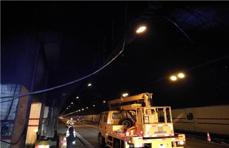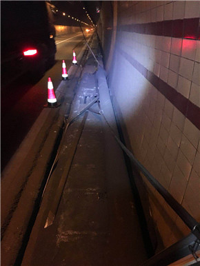 “南廣場有大貨車報警,據(jù)說發(fā)生事故……”4月17日凌晨3時55分,大溪嶺隧道中控室接到了臺州監(jiān)控中心緊急來電,執(zhí)勤隊立即驅(qū)車趕赴現(xiàn)場查勘。 巡邏車到達(dá)南廣場后,執(zhí)勤隊員發(fā)現(xiàn)溫向隧道進(jìn)洞1公里處,隧道頂部的攝像頭被撞損,造成電纜橋架移位,電纜下垂橫跨車道,存在嚴(yán)重安全隱患。事發(fā)突然,執(zhí)勤隊員立刻做好安全預(yù)警措施,同時聯(lián)絡(luò)集團(tuán)工程養(yǎng)護(hù)部機(jī)電維養(yǎng)中心,請求支援開展緊急搶修。