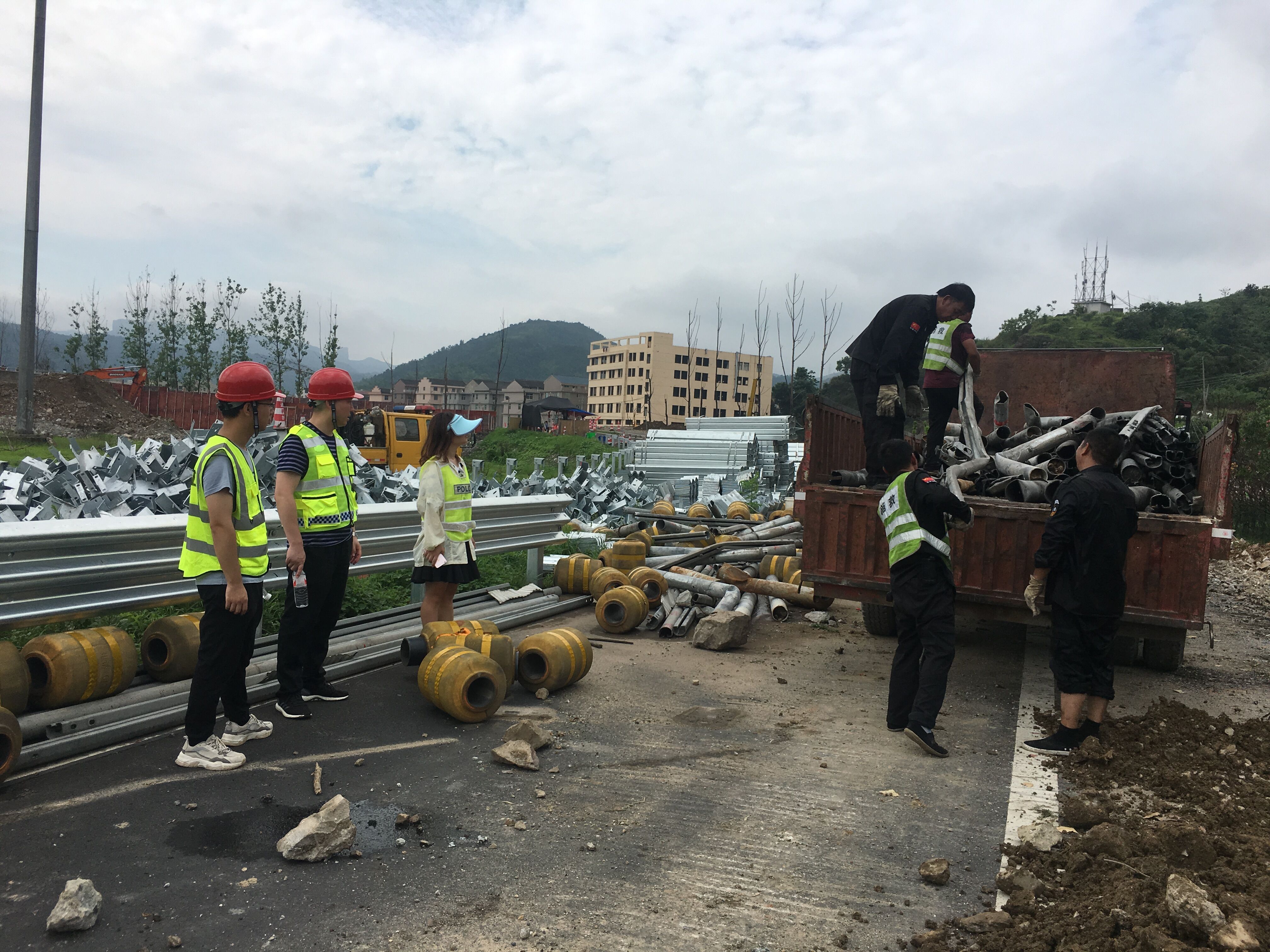 圖為各部門小組人員監督現場 此次廢舊物資數量大,護欄板因高溫沖擊造成了強烈的扭曲變形,這無疑給裝載增加了難度。大家和裝載人員一起想辦法,以便更好地裝車安全抵達院橋磅秤站。盡管天氣燥熱、環境嘈雜,可絲毫未影響小組成員的工作熱情,因時間倉促,所有人利用午休時間加快工作進度,一直堅守現場。在趁車裝載間隙,兵分兩路,一隊現場盯裝車,另一隊由林軍帶領趕往塘嶺廣場、臺州收費所,對阻塊等廢舊物品進行勘察,隨后又馬不停蹄趕往院橋磅秤站匯合監督過磅環節。 直至下午5點,大家終于結束工作。據統計,此次共處理廢棄物資約15噸。 毛譯聆
