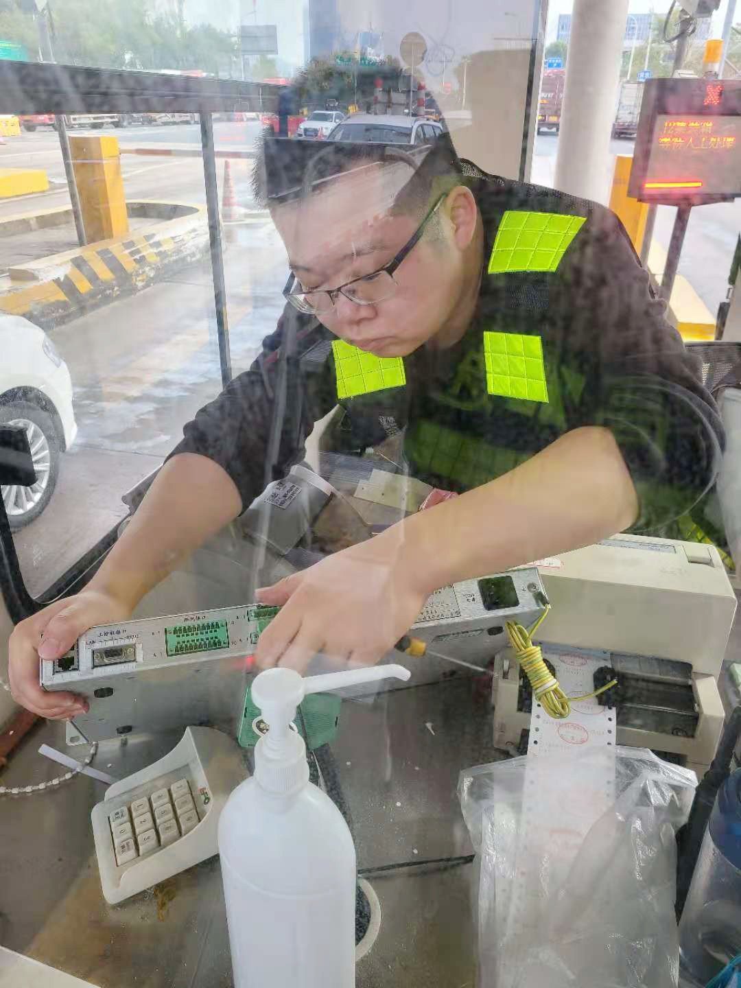 “咦,崗亭桌上的這個扁長形設備哪里去了,忽然感覺桌面整潔了好多!”剛來交班的臺州收費所收費員李靜一臉疑惑,“拿掉了這個設備,ETC車輛還能正常通行嗎?” “不是拿掉了,是我們給它般了個‘新家’而已。”工程部機電設備維養(yǎng)中心陳華棟指了指安裝在桌面下方的設備。