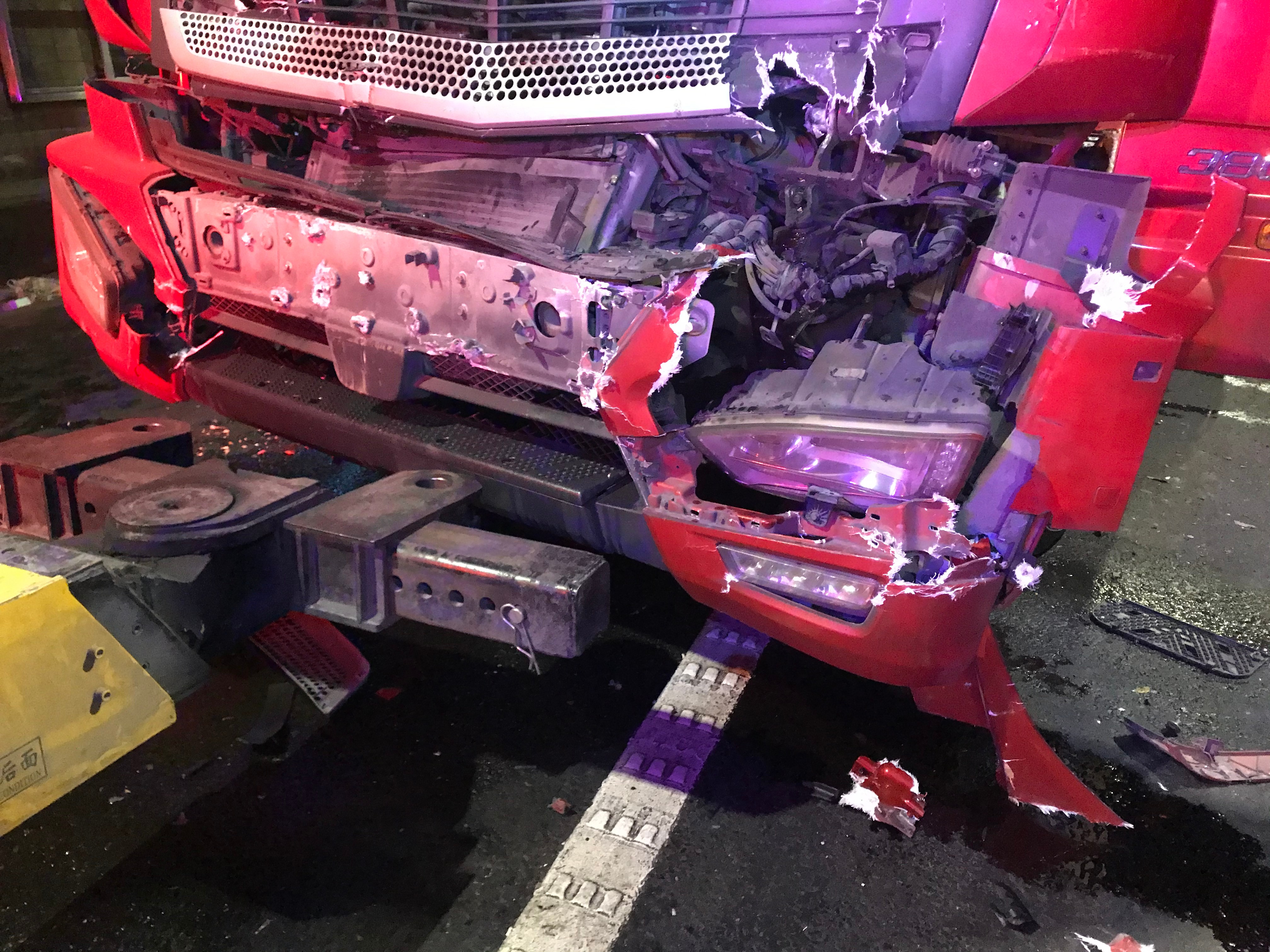 1月14日晚21:30分,甬臺溫高速寧波方向距離臺州南收費站約5公里的路段,一輛半掛車與一輛小轎車發生碰撞,現場急需一大一小兩輛拖車。