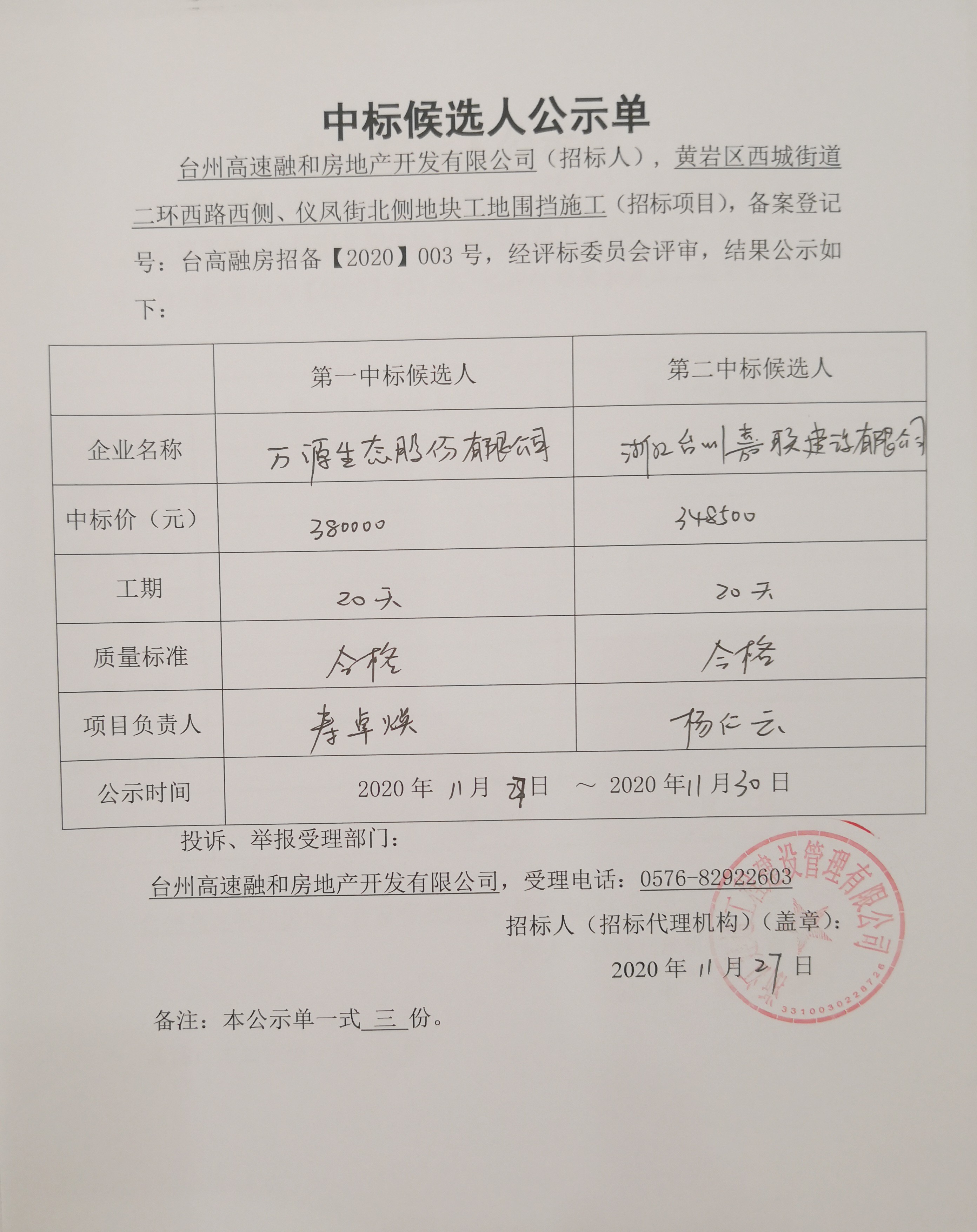 黃巖區(qū)西城街道二環(huán)西路西側(cè)、儀鳳街北側(cè)地塊工地圍擋施工(招標(biāo)項(xiàng)目)中標(biāo)候選人公示單