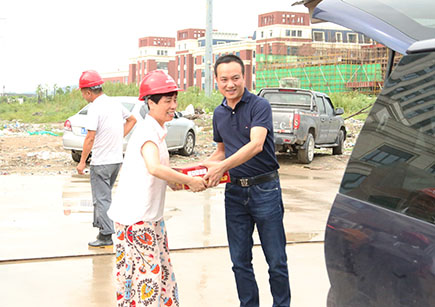 圖為仁和房產公司副總經理鐘彪向施工人員遞送慰問品 7月份以來,我市持續高溫,給人民正常的生產生活帶來不少影響。眼下,文鼎苑項目正處工程進度關鍵時期,為保障8月份首期開盤目標,施工、監理單位克服高溫天氣重重困難,通過調整工人上班時間避開中午高溫時段等方法,確保高溫天氣下施工不換檔、不降速。目前,1號樓已進入第2層樓面的施工,4號樓也進入了第1層樓面的施工,預計8月份可以完成預售進度。 仁和房產公司為了表達對一線工作人員的關懷和慰問,感謝他們在高溫天氣下的堅守與敬業,由公司董事長、總經理羅小將帶隊,與經營班子其它成員一起來到文鼎苑樓盤工地進行慰問。在工地現場辦公點,羅小將將防暑食品和藥品交送到施工和監理單位的員工手中,并對他們的辛勞工作表達了真摯的問候和衷心的感謝。 包啟曉