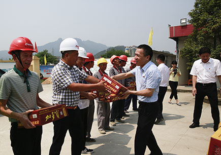 圖為公司副董事長、總經(jīng)理張建平給一線人員送上消暑慰問品